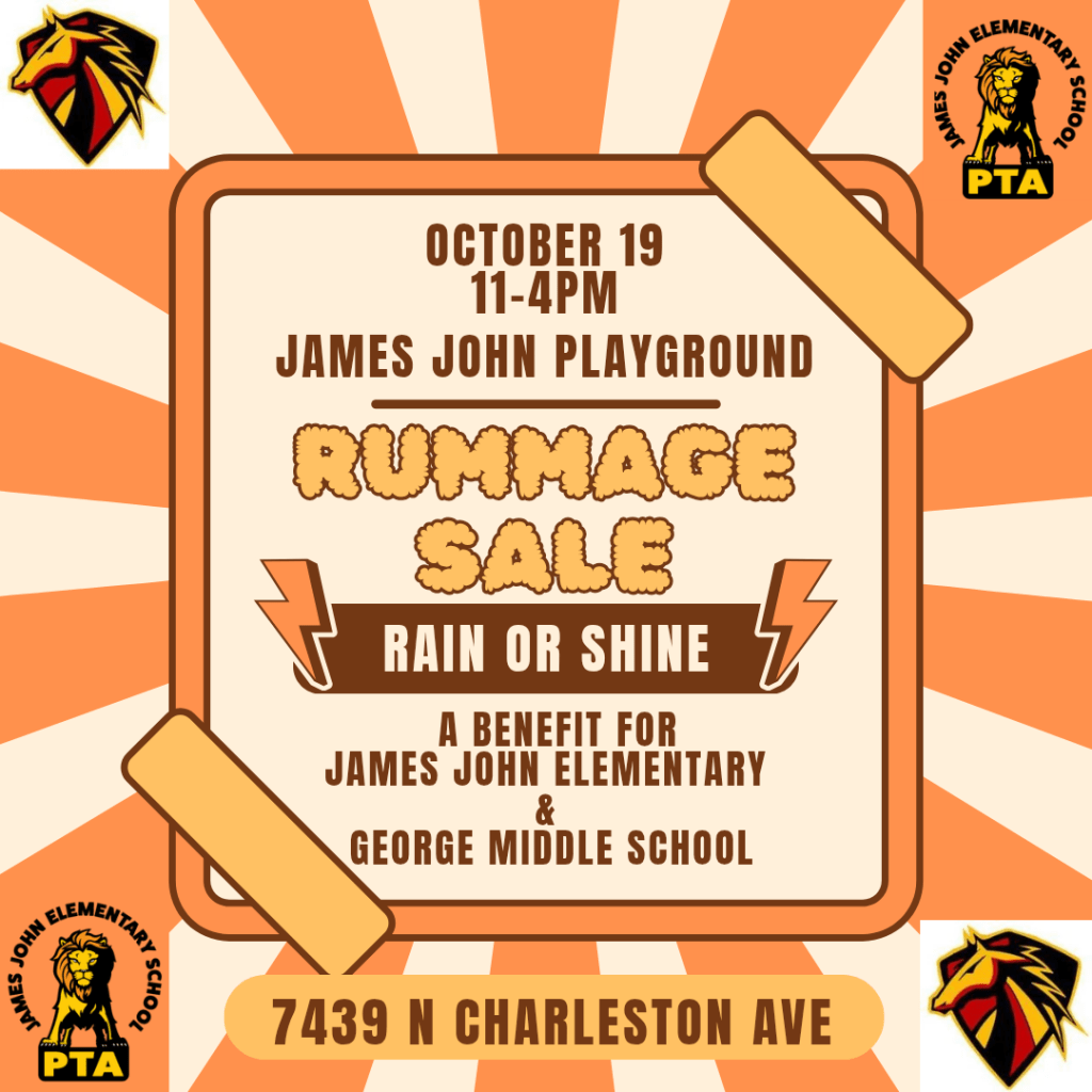We are hosting a Rummage Sale to benefit both James John Elementary and George Middle School on October 19 from 11:00am-4:00pm on the James John Playground (7439 N Charleston Ave).